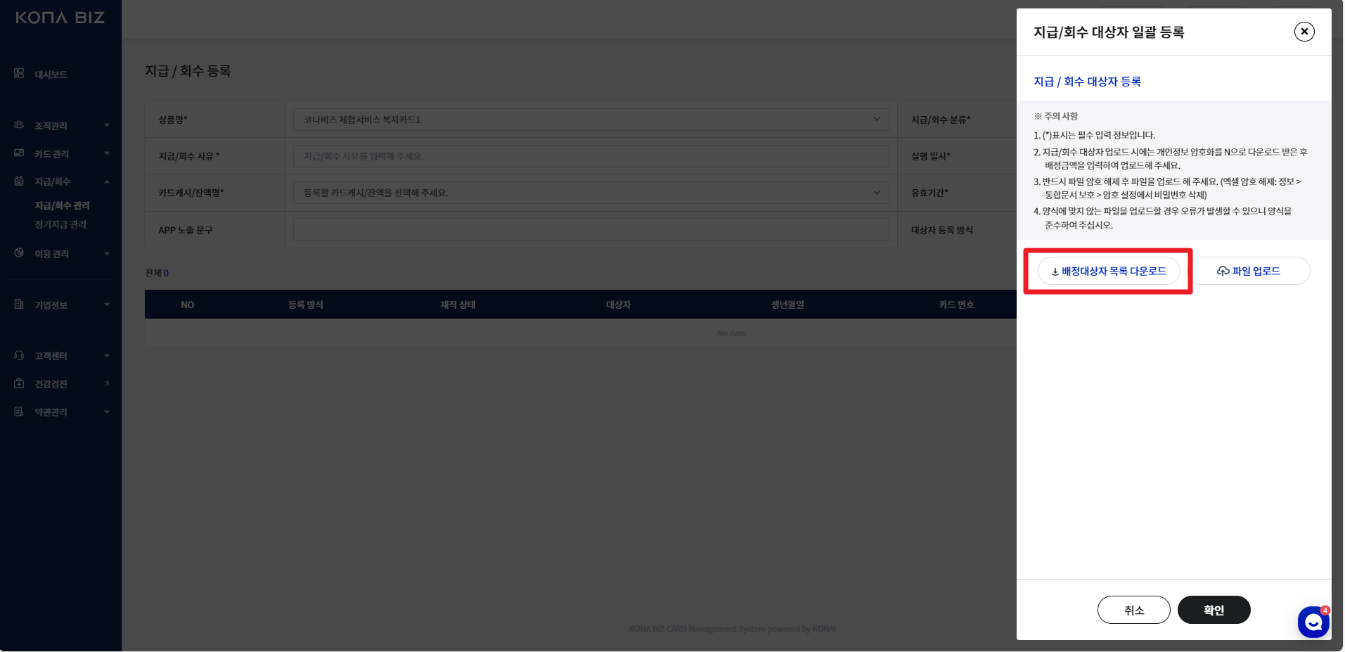지급/회수 목록 다운로드 시 2가지 유형 중 선택하여 다운로드 가능합니다.