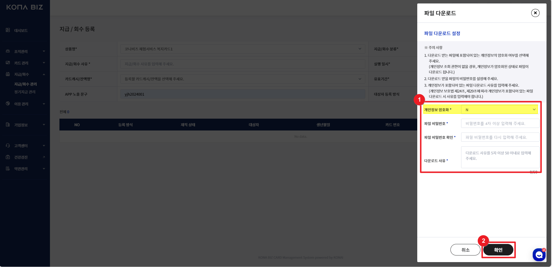 개인정보 암호화 | N으로 선택 ( Y 선택 시 파일의 내용이 마스킹처리 됩니다.) |