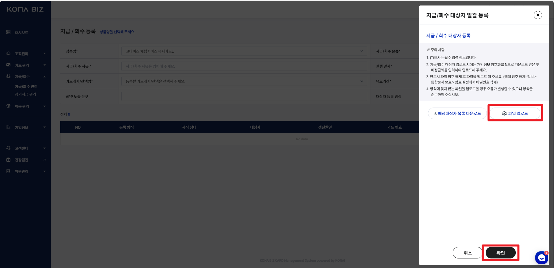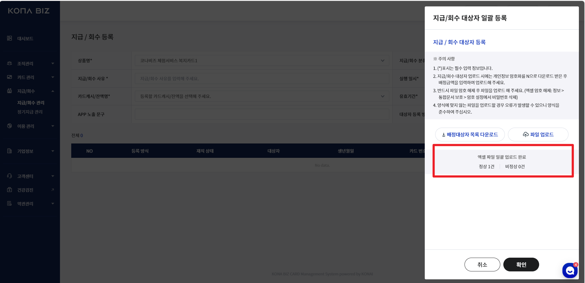 다수의 지급 건 + 지급/회수액이 개별로 상이할 경우 엑셀 업로드를 통해 일괄 등록이 가능합니다.