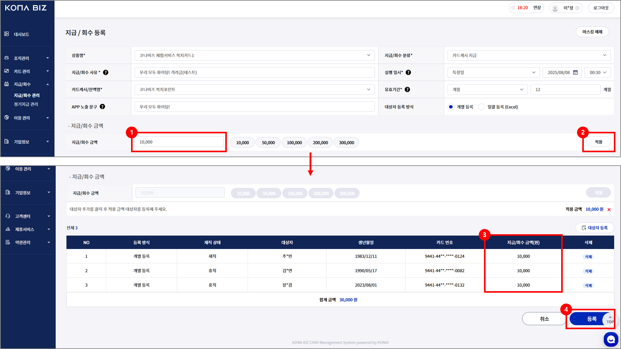 3.금액 입력 - 적용 - 등록
