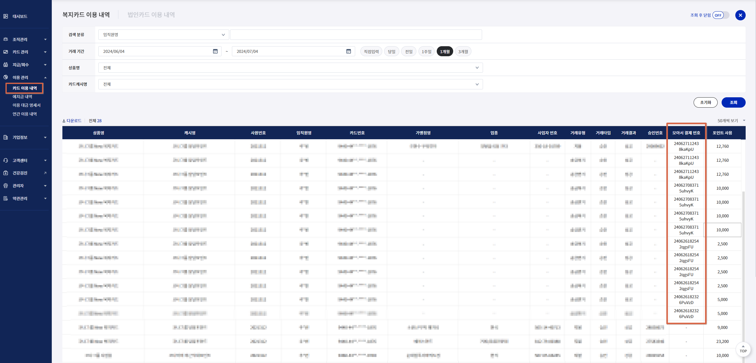 관리자는 카드 이용 내역 메뉴를 통해 모아서 결제 내역을 확인할 수 있어요.