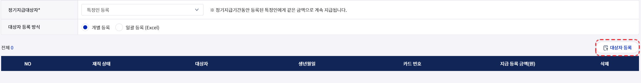 개별 등록 : 개별 대상자 선택 후 등록이 가능합니다.