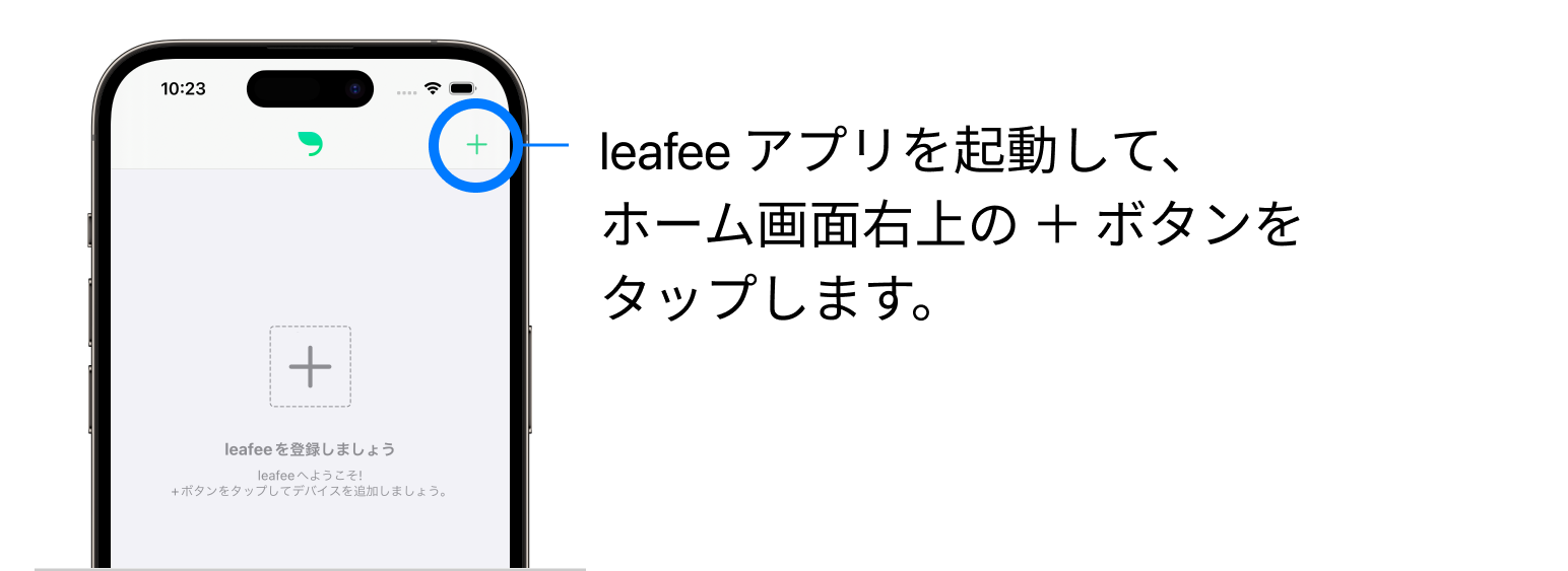 leafee アプリを立ち上げ、[ホーム] 画面の右上にある [+] ボタンをタップします。