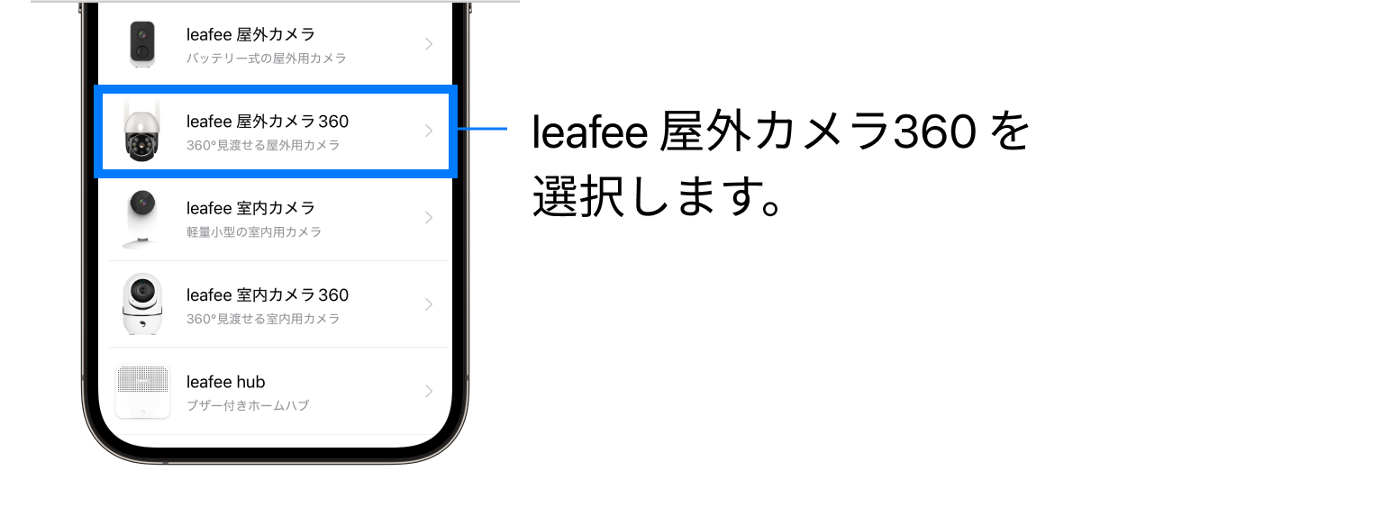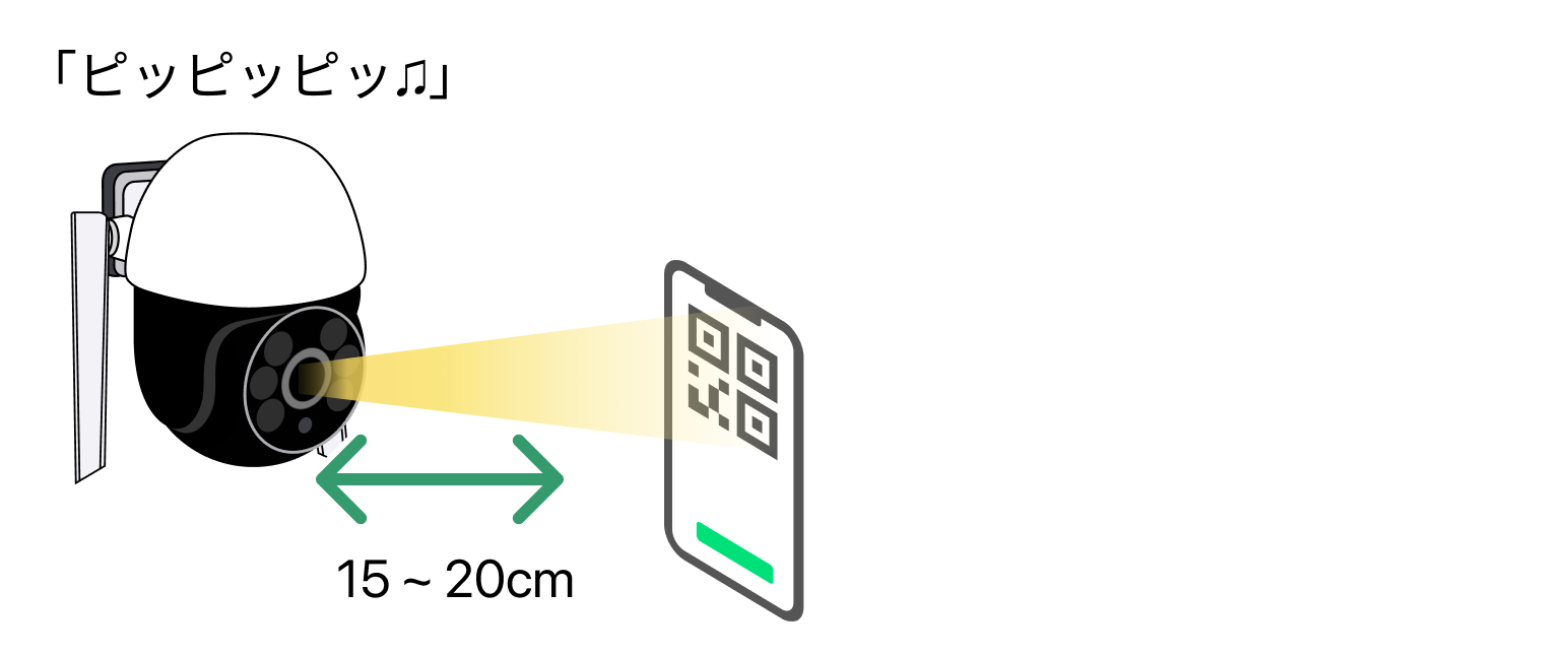 表示された QR コードを leafee 屋外カメラ に向けます。※ QR コードとカメラの距離を 15~20cm 程度に保ってください。スキャンが完了すると、カメラ本体から「ピッピッピッ♪」と音が鳴ります。うまくスキャンできない場合、QR コードをゆっくり前後させてください。