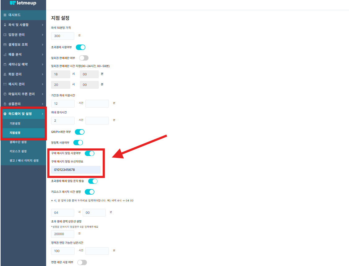 • 렛미업 관리자페이지 > 하드웨어 및 설정 > 지점설정