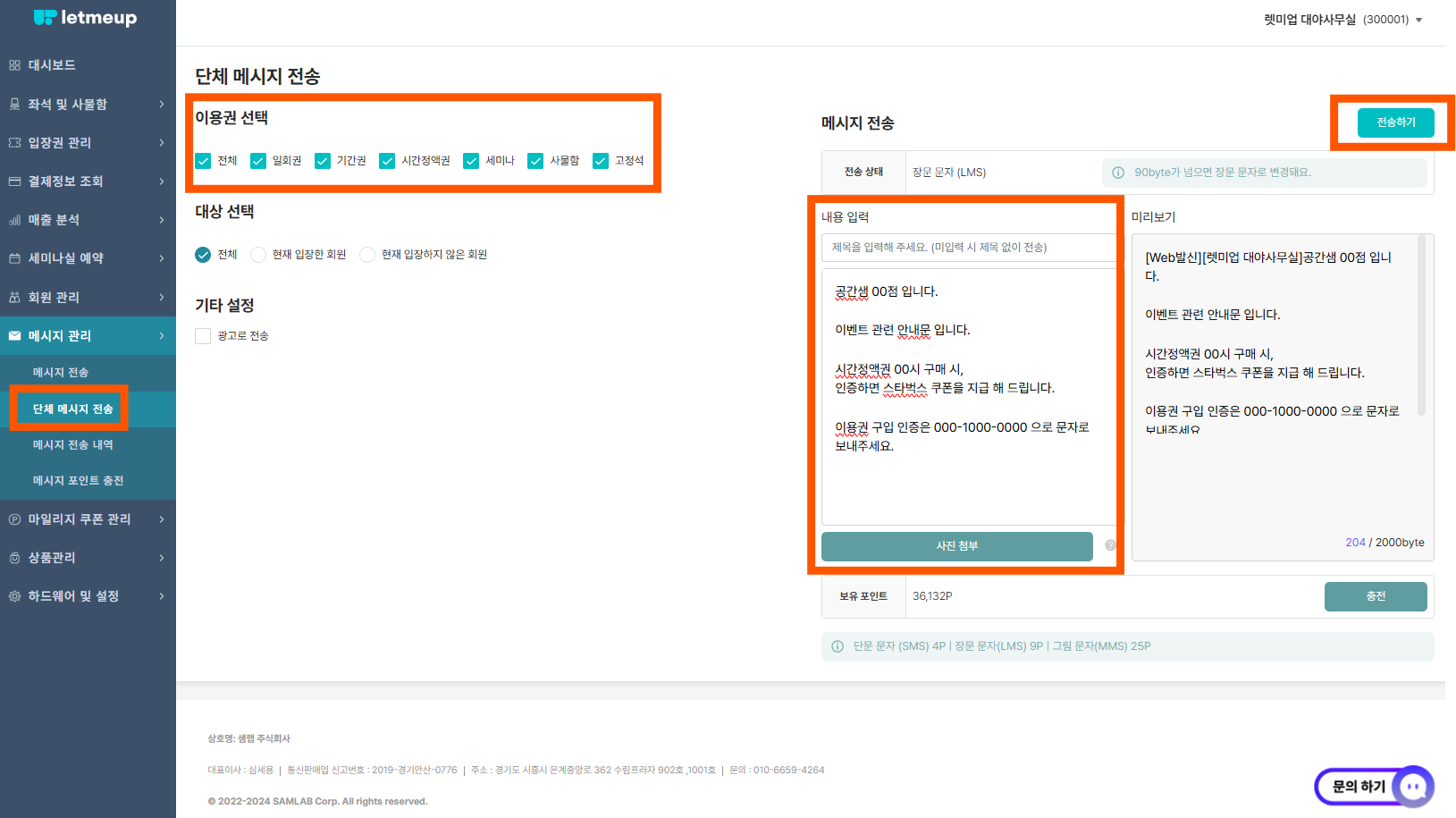 렛미업 백오피스의 단체메세지 발송기능은 ‘입장권 보유’ 기준 입니다.