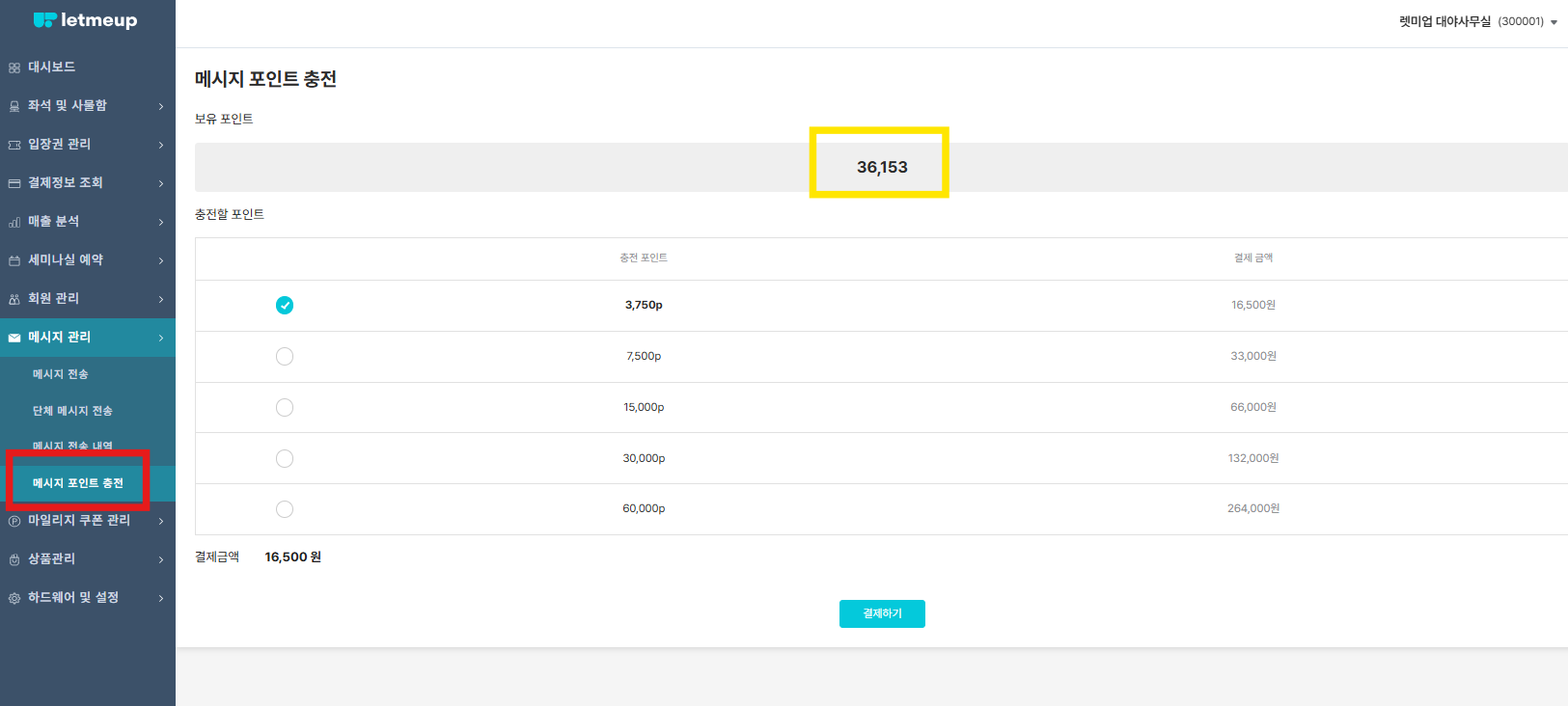 메시지관리 → 메시지 포인트 충전
