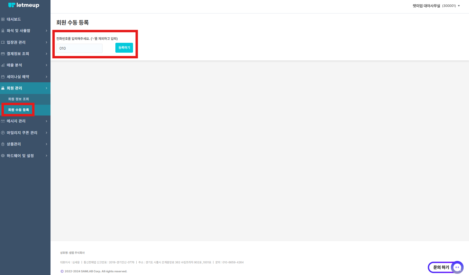 ☞ 등록 할 회원 전화번호를 입력 후 [등록하기] 버튼 클릭