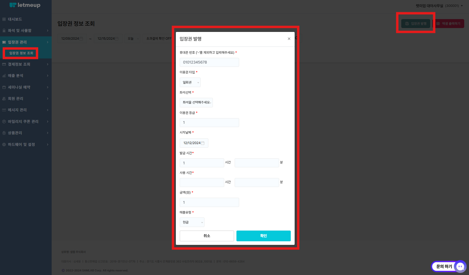 입장권 조회하는 방법 [렛미업 관리자페이지] - 입장권 관리 → 입장권 정보조회 [아래 기능을 사용할 수 있어요.] - 우리매장을 이용하고 있는 회원들의 입장권을 조회 및 관리할 수 있어요. ☞ 기간을 선택하여, 원하는 날짜를 조회할 수 있어요. ☞ 전화번호, 등급, 사용상태 등, 유형에 따라 선택하여 조회할 수 있어요. --- 입장권 정보 수정하는 방법 [렛미업 관리자페이지] - 입장권 관리 → 입장권 정보조회 → 자세히 [아래 기능을 사용할 수 있어요.] - 입장권에 대한 상세 정보를 확인할 수 있습니다. - 등급 수정 - 유효기간 시작 및 만료일 강제지정 - 시간정액권 시간 추가 - 기간권 기간 추가