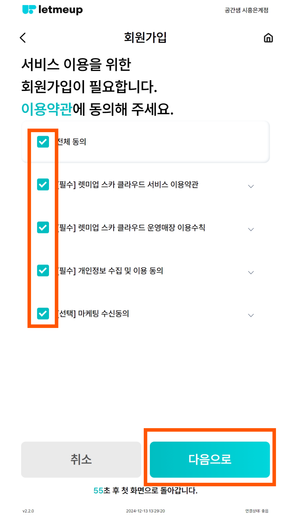 서비스 이용약관 선택 후 [다음으로] 버튼 클릭