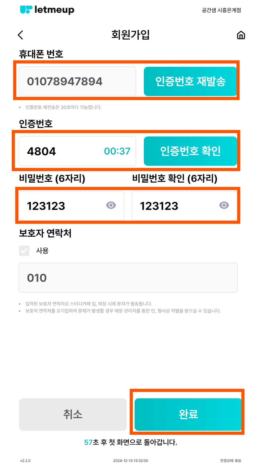 인증번호 입력 후 [인증번호 확인]버튼 클릭