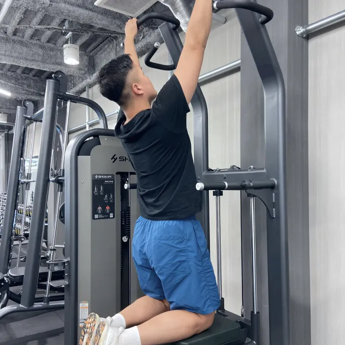体を引き上げ(懸垂)、ゆっくりと元の位置に戻します。