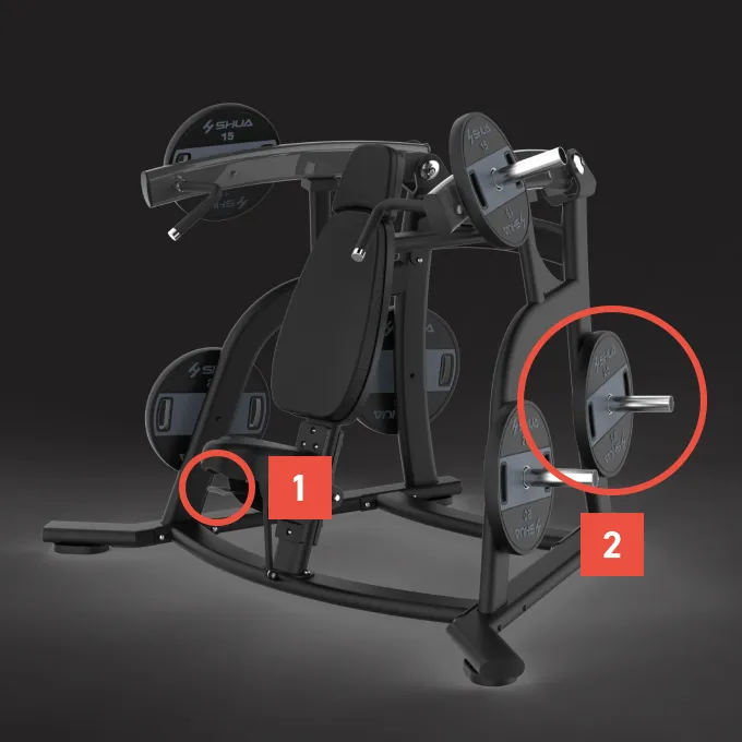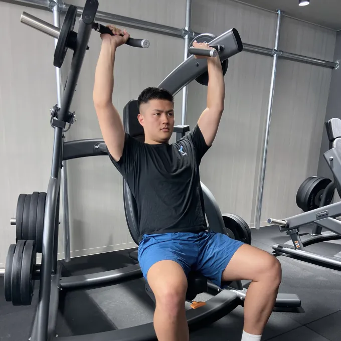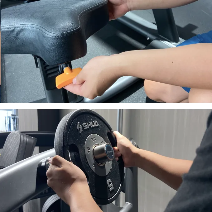 シートの高さを調節します。肩の上にバーがあるくらいの高さが目安です。プレートで重量を設定しましょう。
