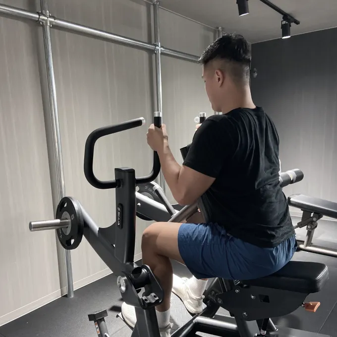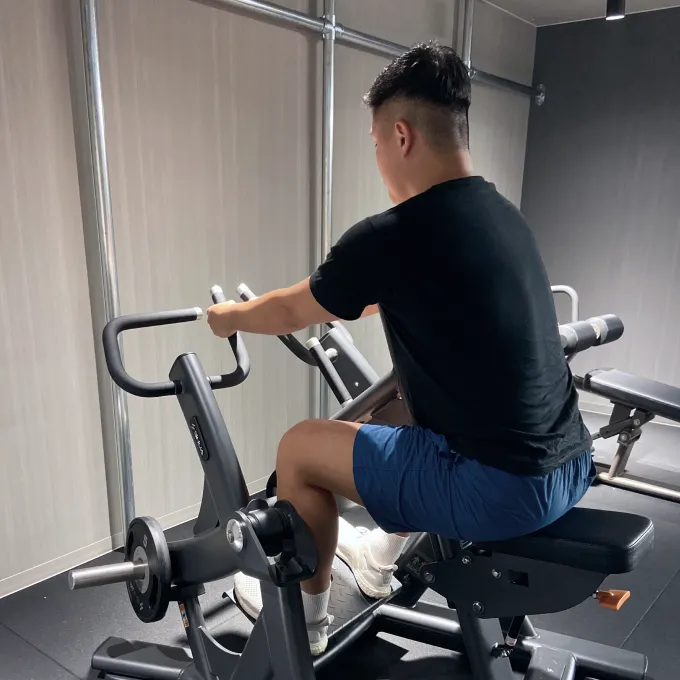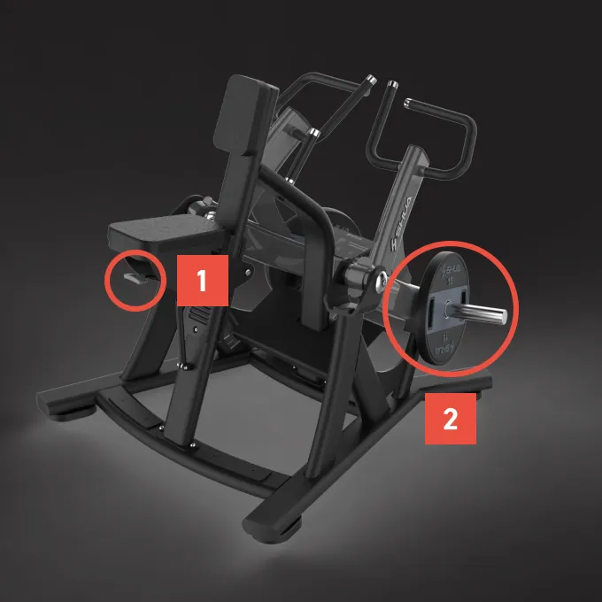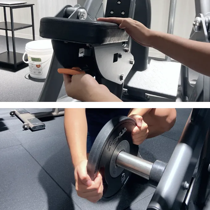座った時に太ももが水平になる高さにシートを調節します。プレートで重量を設定しましょう。