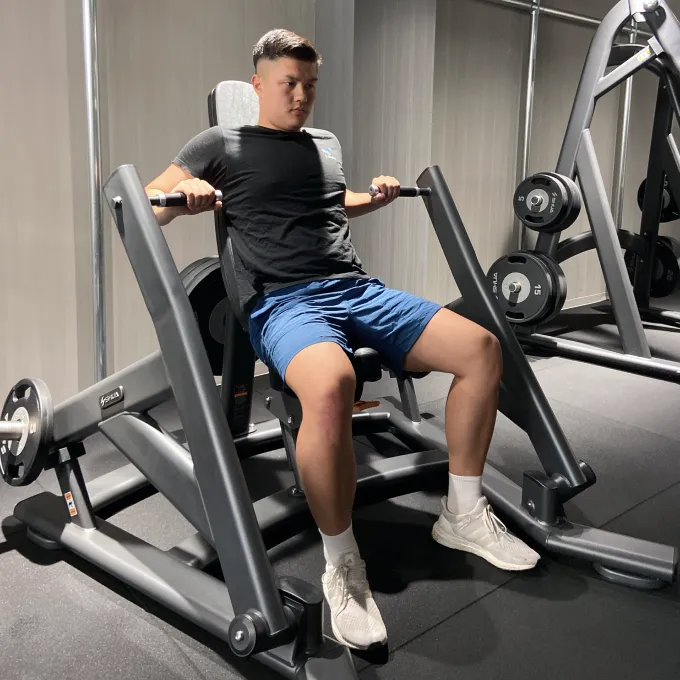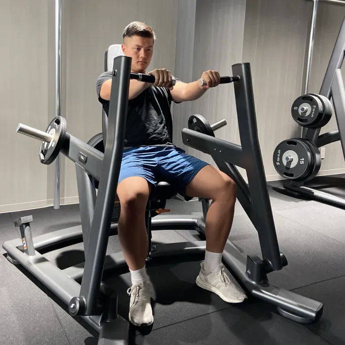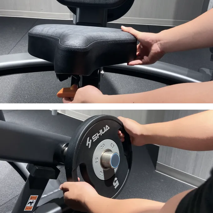 シートの高さを調節します。座った時に胸の位置にバーの高さがある事が目安です。プレートで重量を設定しましょう。
