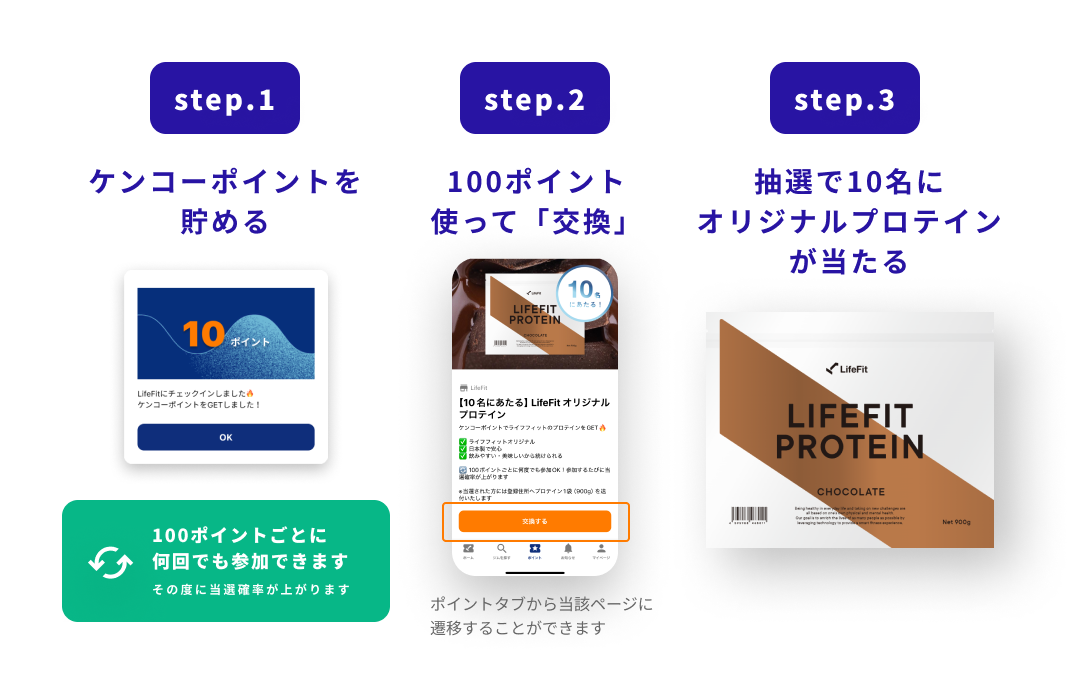 賞品受け取り: LifeFit オリジナルプロテイン1袋(900g)をアプリの登録住所に送付いたします