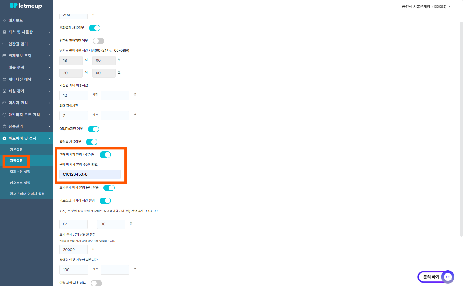 • 하드웨어 및 설정 → 지점 설정 → 구매 메시지 알림 사용여부 활성화
