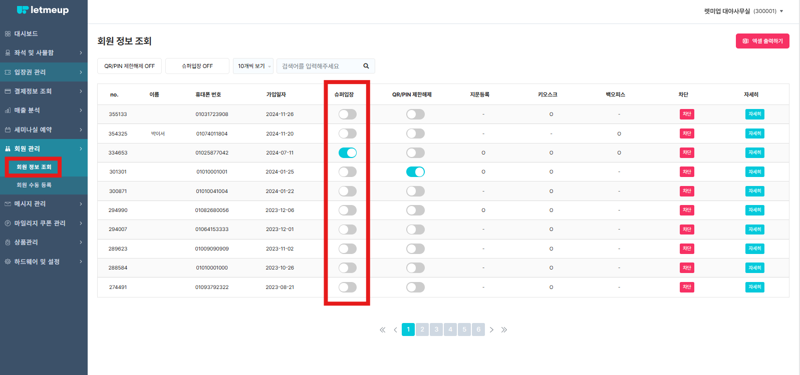 회원 관리 → 회원 정보 조회 → 슈퍼입장 기능 활성화