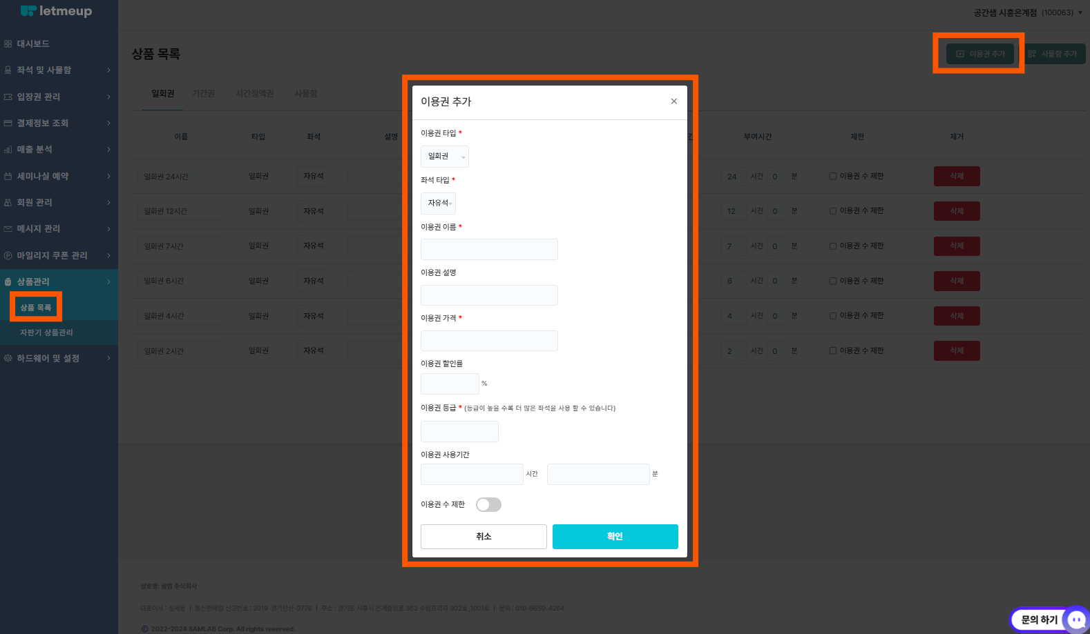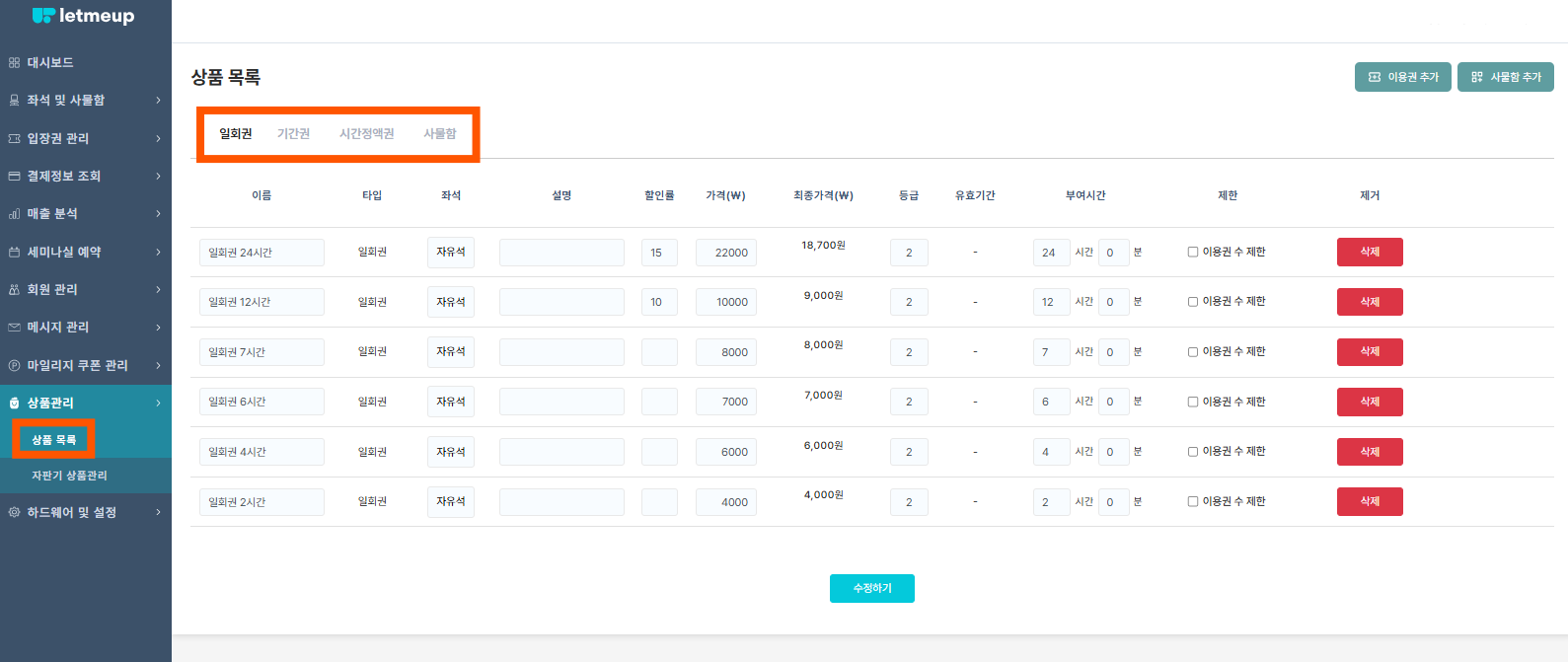 ☞ 이용권 타입은 3가지로 나뉩니다. 일회권, 시간정액권, 기간권