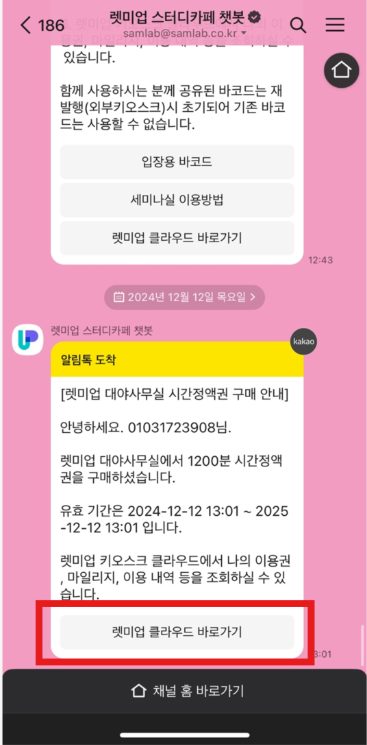 1. 회원이 이용권구매시 전송되는 알림톡에서 링크 확인