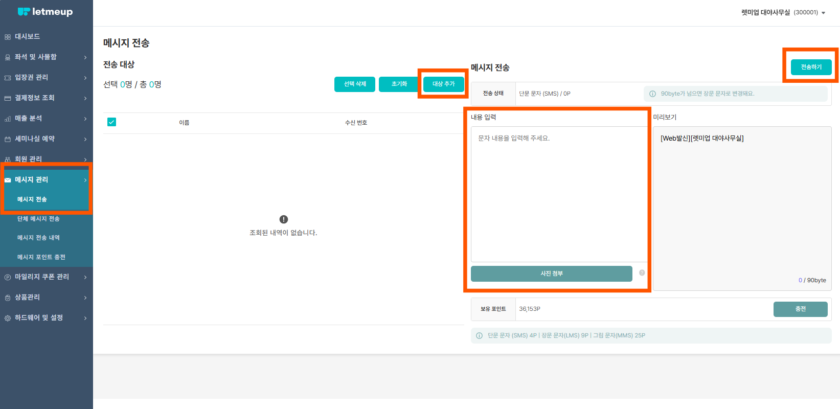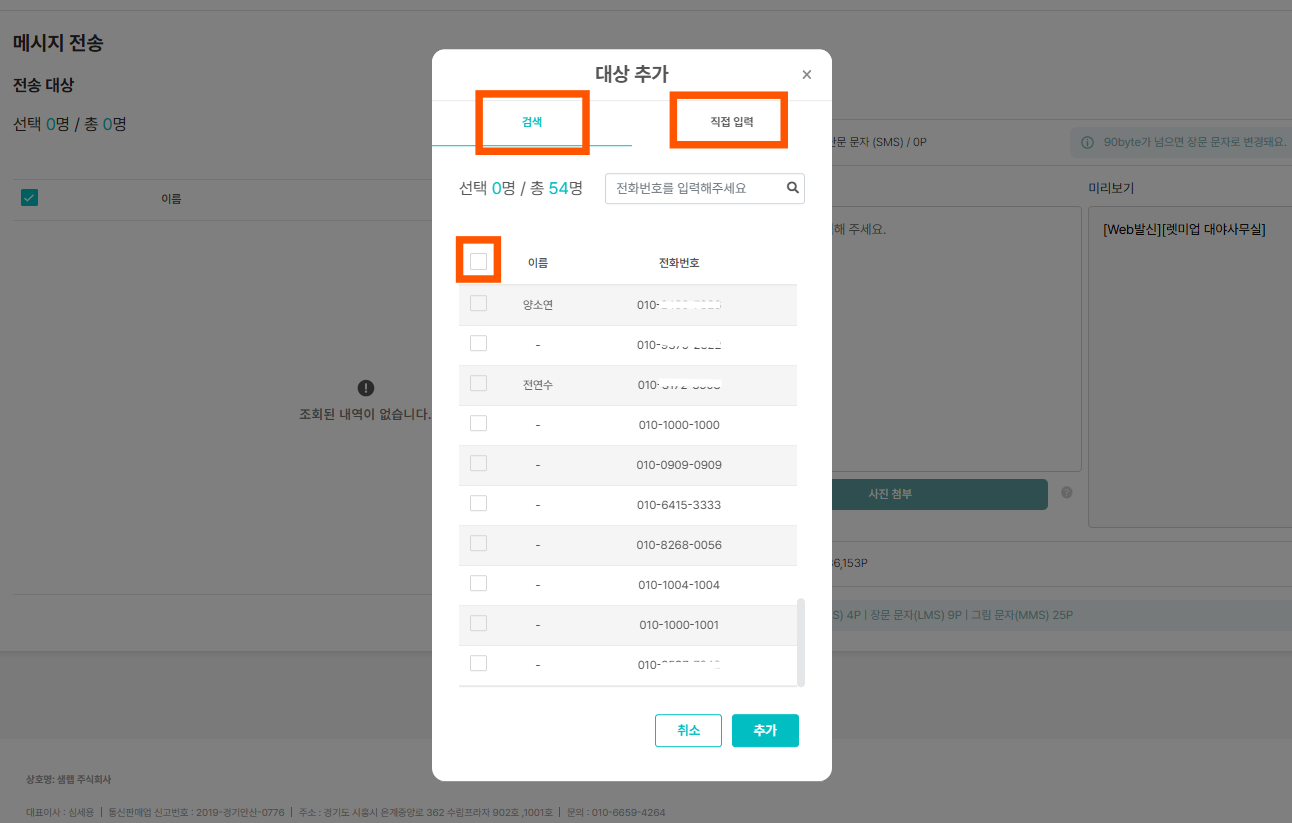 메시지관리 → 메시지 전송 → 대상추가
