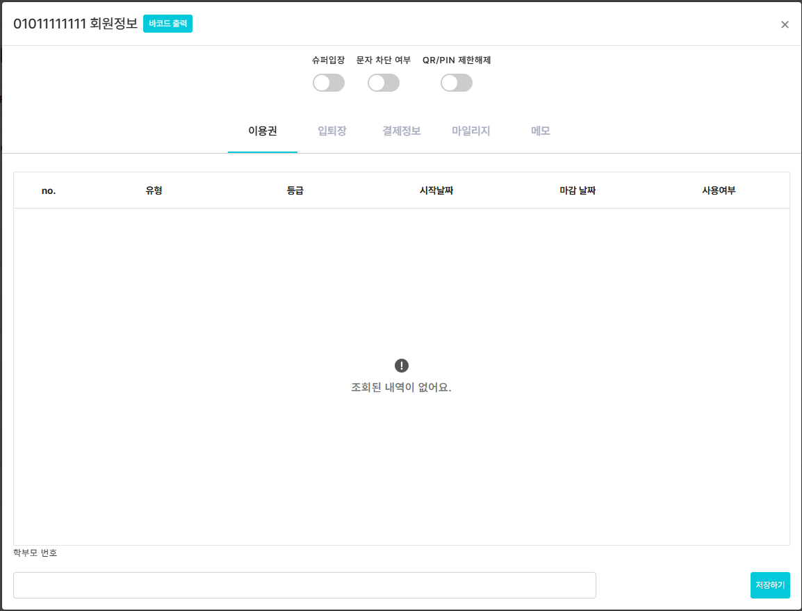 회원 상세 보기에서 왼쪽 상단에서 바코드를 출력해 주세요. (입장권이 있는 회원만 가능)