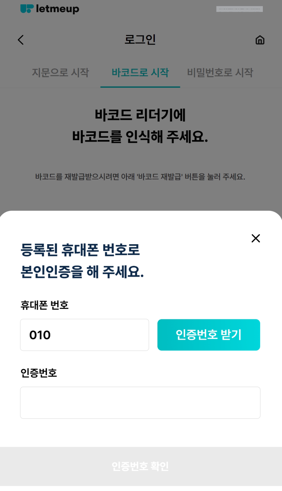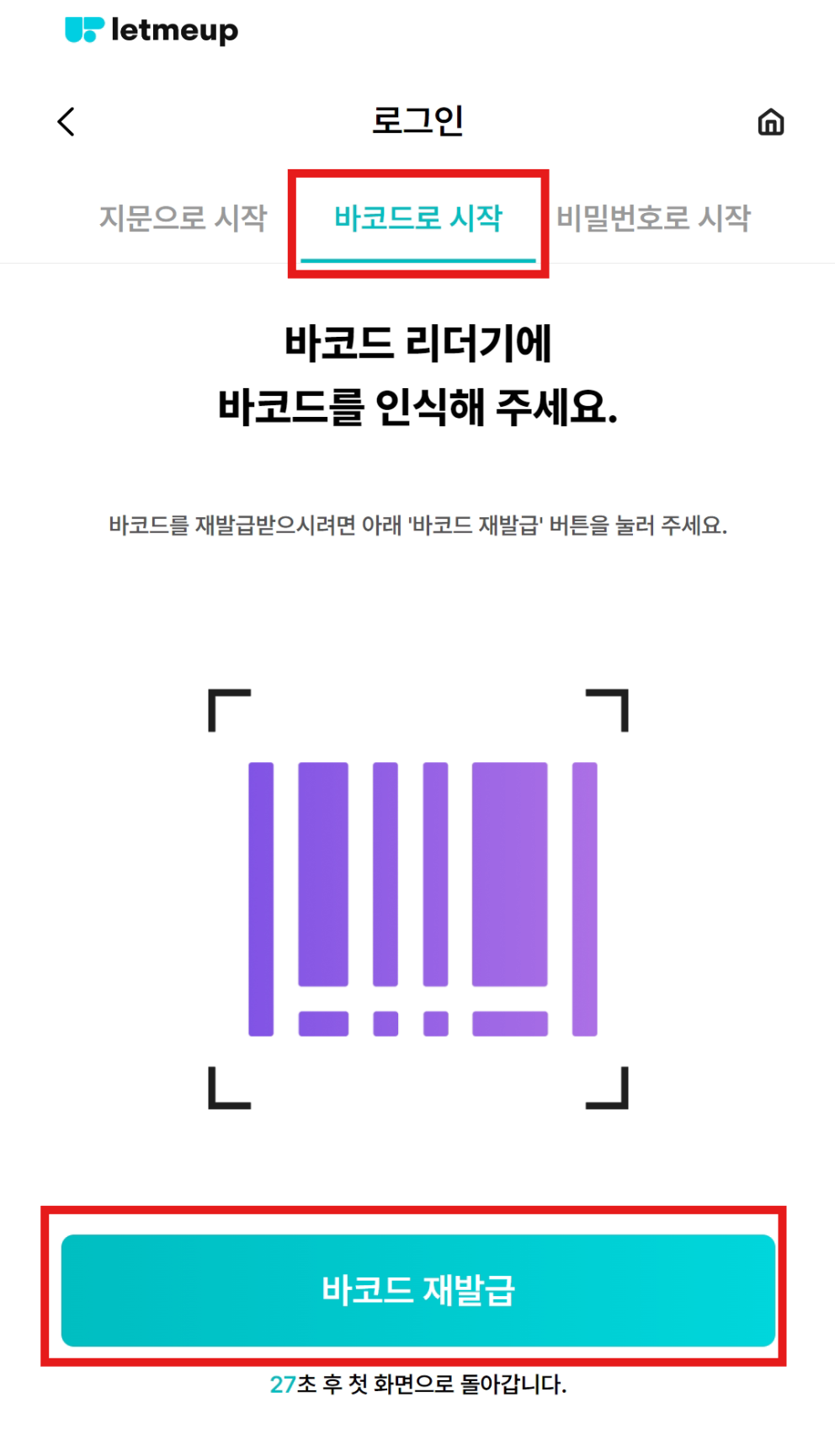 [바코드로 시작] → [바코드 재발급] 버튼을 눌러주세요.