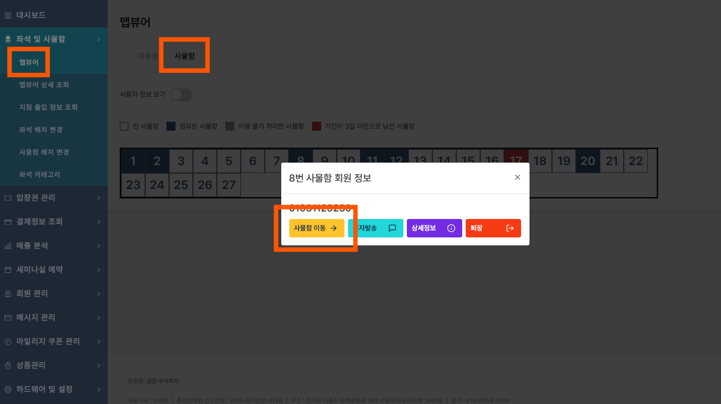 이동시킬 회원 선택 후, 사물함이동 클릭