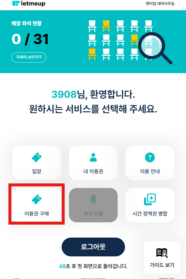 키오스크 메인 화면에서 로그인을 한 뒤, [이용권 구매] 버튼을 눌러주세요.