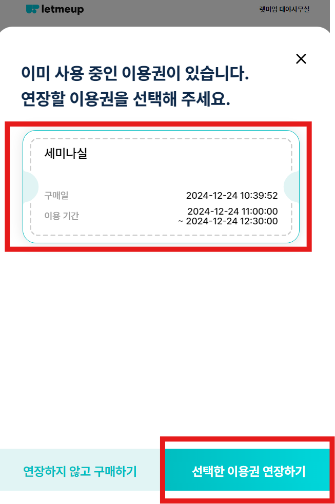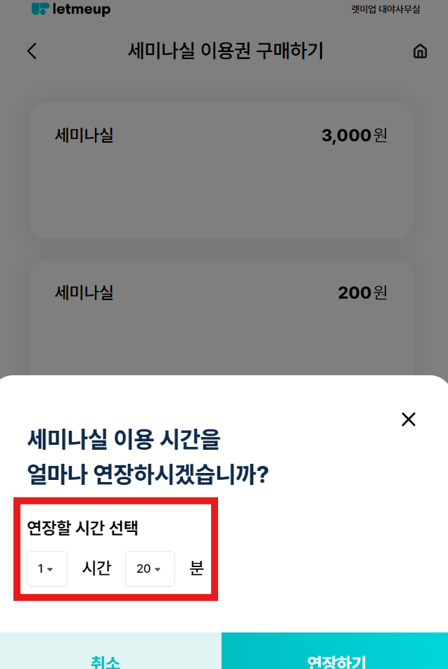 연장 할 시간을 선택 한 뒤, [연장하기] 버튼을 눌러 결제를 진행해주시면