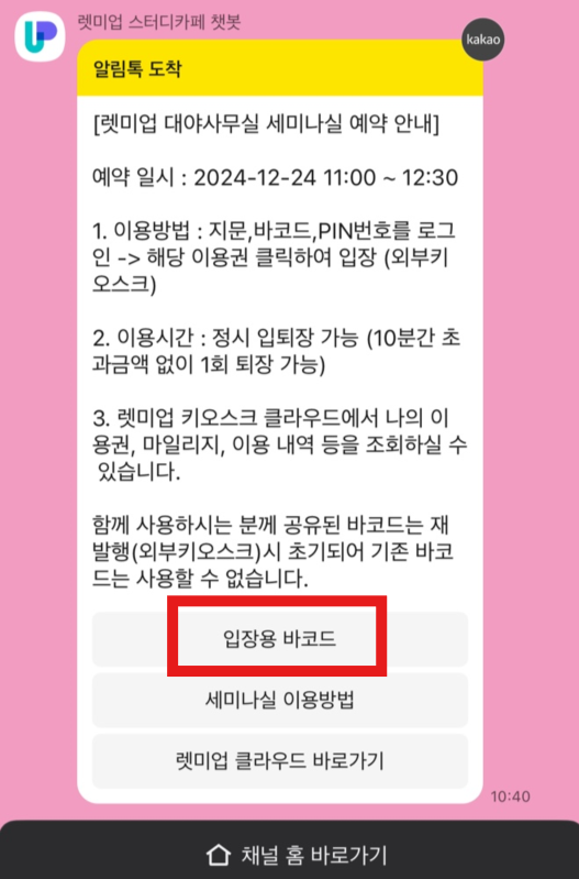 [렛미업 스터디카페 챗봇] 채널에서 입장용바코드가 알림톡으로 전송 됩니다.