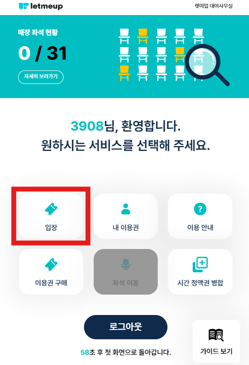 [입장] 버튼을 누르면 문이 열리고, 세미나실 이용 하면 됩니다.