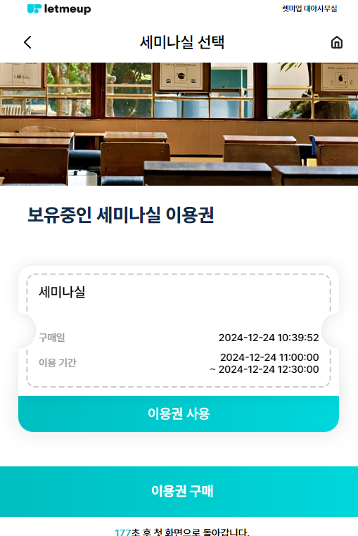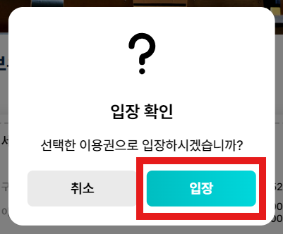 예약한 세미나실 입장권이 확인 되면, [이용권 사용] 버튼을 눌러주세요.
