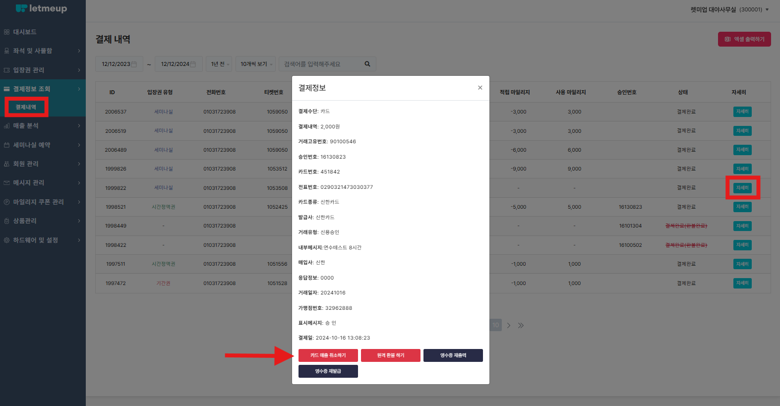 결제정보 조회 → 결제내역 → 회원번호 조회 → 자세히