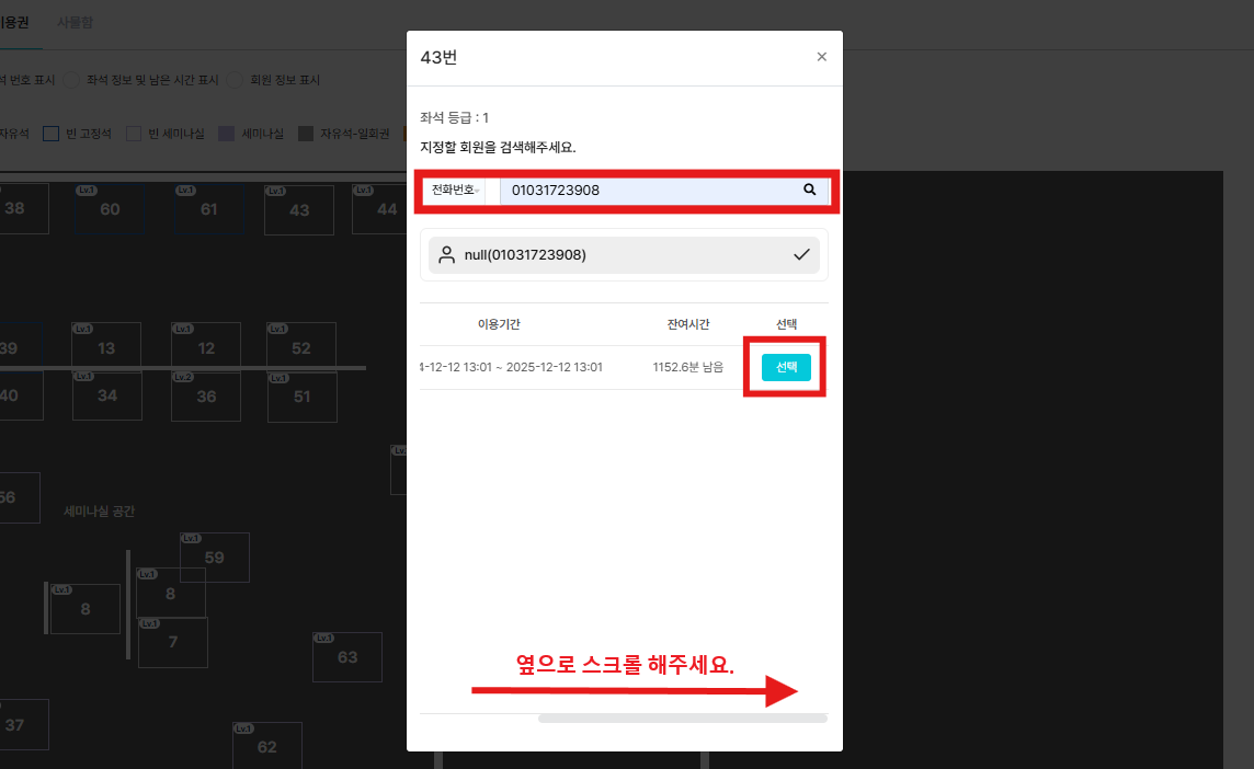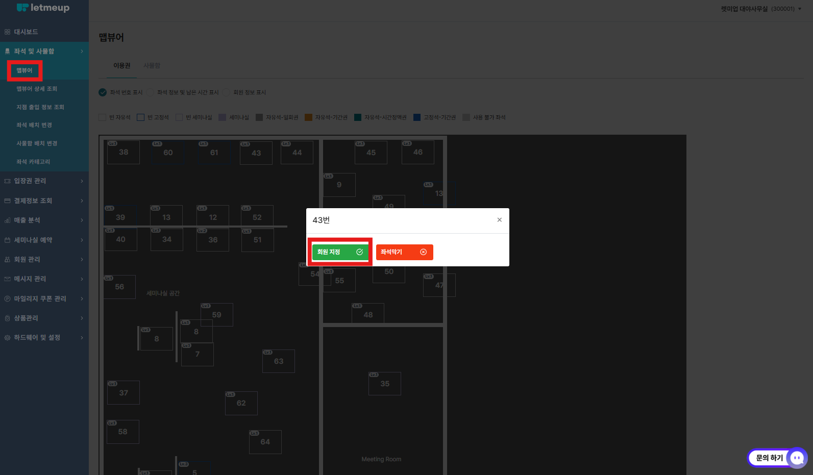 좌석 및 사물함 → 맵뷰어 → 점유시킬 좌석 클릭 → 회원지정