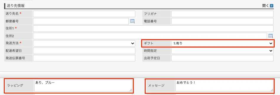 ※ギフト「0:無し」と設定し、ラッピング/メッセージを入力した場合、ラッピング/メッセージはロジクラに取り込まれません。ギフト「1:有り」であることを確認してください。