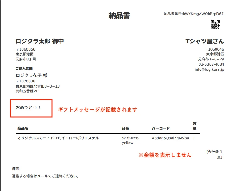 ギフトメッセージが登録されている場合、納品書に記載されます。