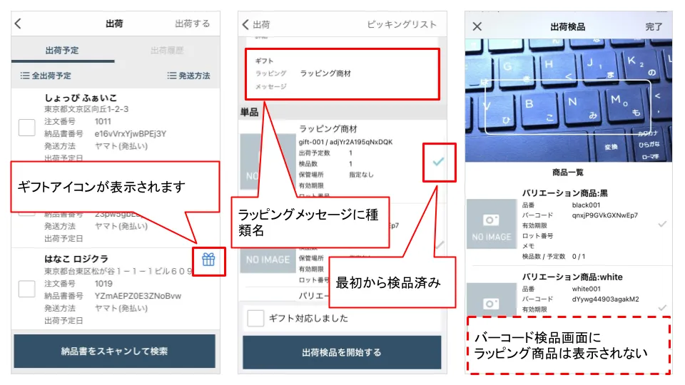 ロジクラの出荷予定にギフトフラグが設定され、ラッピングにギフト対象の種類名が表示されます。