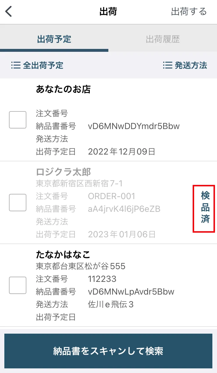 注文にあるすべての商品をスキャンし検品完了とし、作業を中断することができます。出荷予定一覧に検品済のマークがつくと検品やり直しや修正することはできません。