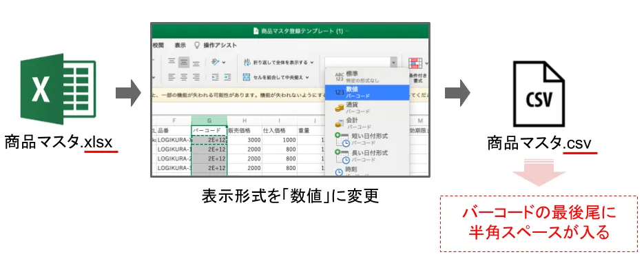 これを解決しようと、表示形式を「数値」に変更し、そのままCSVで保存すると、文字列の最後尾に半角スペースが入ってしまいます。(Excelファイル(拡張子が.xslxのもの)を編集してCSVで保存する際に発生します。)