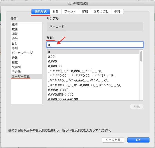 「種類」に半角の0(ゼロ)をひとつ入力し「OK」をクリックします。