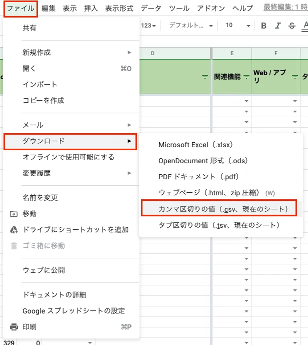 GoogleスプレッドシートをCSV形式でダウンロードします。