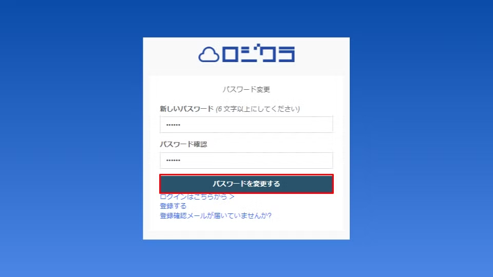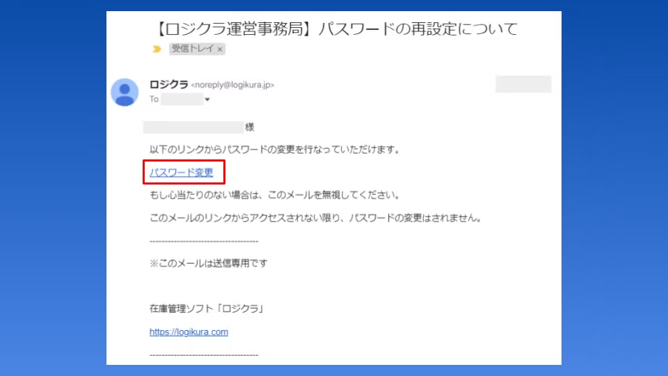 ロジクラからパスワード変更メールが届きます。本文に記載されている変更用URL「パスワード変更」にアクセスして下さい。