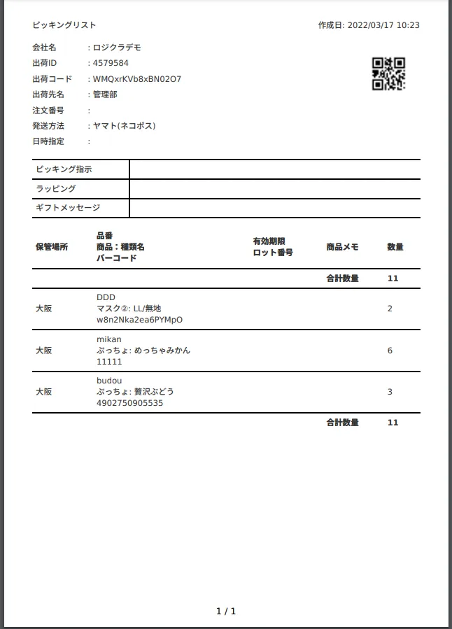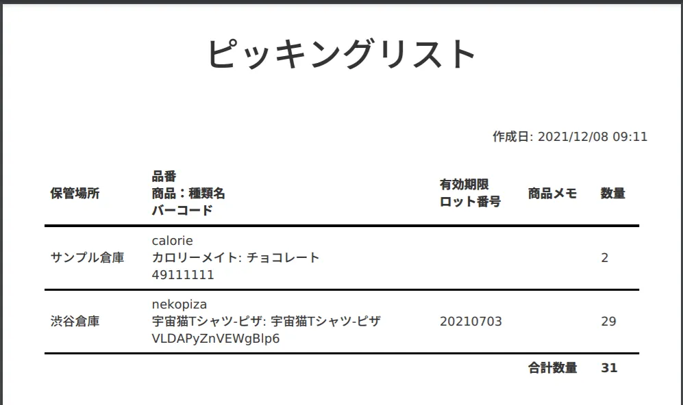出荷前に商品をピックアップするための一覧になります。作業担当者はこのリストを見ながら棚から商品をピックアップします。