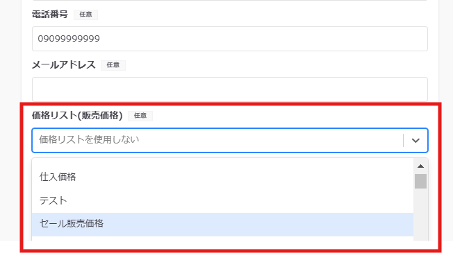 対象の出荷先編集画面を登録した価格リスト名を選択します。