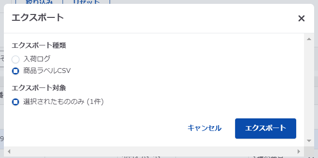 メニュー> ”入荷”、またはログ> "入荷実績" を開き、ラベルを発行したい入荷情報を選択してから「エクスポート」をクリックします。