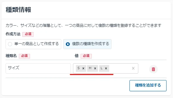 複数SKU(サイズ、カラーなどのバリエーション)がある商品は、「複数の種類を追加する」よりご登録ください。