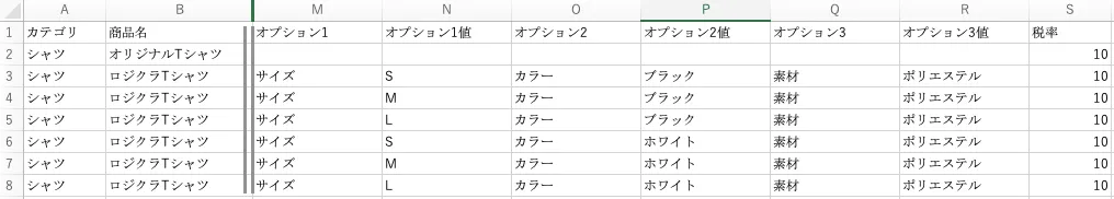 オプションが空欄の場合、種類名は商品名が登録されます。
