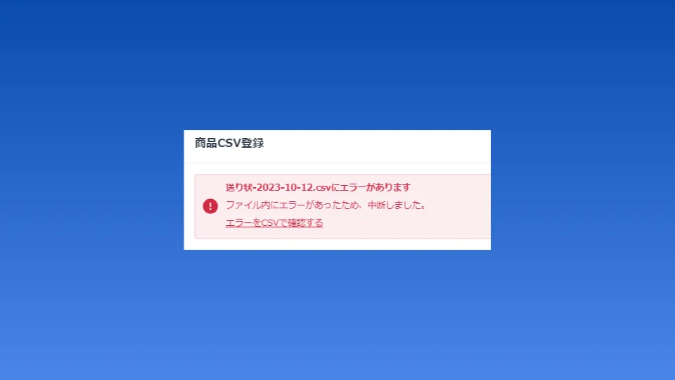 「エラーをCSVで確認する」をクリックしダウンロードされたCSVを開き、エラー内容を確認してください。