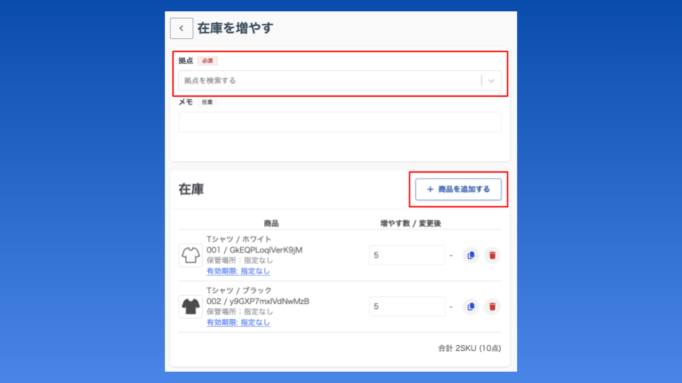 在庫を作成する拠点を選択 > 「+商品を追加する」から商品を選択